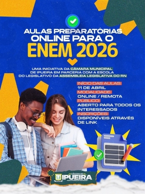 A Câmara Municipal de Ipueira, em parceria com a Escola do Legislativo da Assembleia Legislativa do Rio Grande do Norte, estará disponibilizando aulas preparatórias gratuitas para o ENEM 2026. A iniciativa tem como objetivo ampliar o acesso à educação e proporcionar mais oportunidades de preparação para os estudantes e demais interessados do município.
